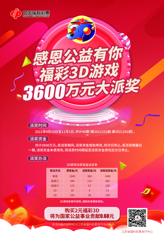 為回饋廣大購(gòu)彩者的支持,自919日起,江蘇福彩開展3D游戲3600萬(wàn)元大派獎(jiǎng)活動(dòng),返獎(jiǎng)率高達(dá)70%