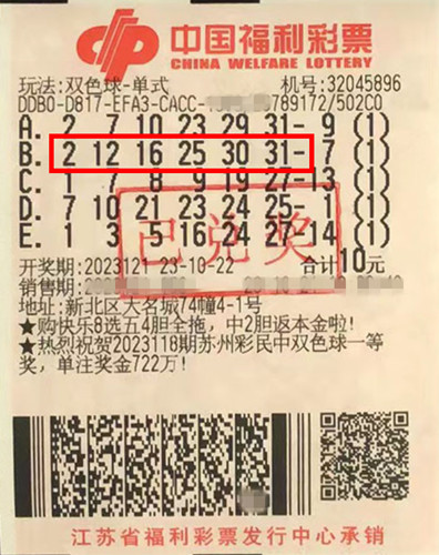 據(jù)了解,該獎出自新北區(qū)大名城32045896福彩銷售點。當期幸運市民楊女士(化名)在店里花10元隨機投注了5組雙色球單式號碼。經(jīng)與當期開獎號碼“紅球2、12、16、25、30、31,藍球12”核對,其中一組紅球全中,中得1注二等獎,攬獲獎金26.7萬余元。