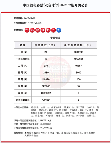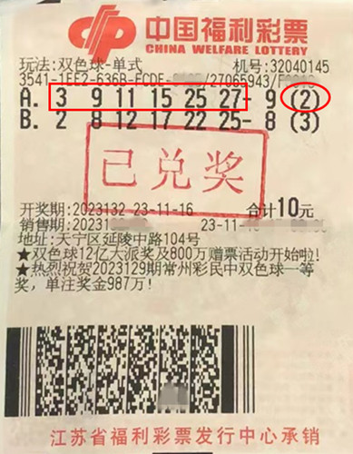 11月16日,雙色球第2023132期開出紅球3、9、11、15、25、27,藍球1。其中,二等獎中出339注,單注獎金9.15萬余元。當期一位購彩者在天寧區(qū)延陵中路32040145福彩投注站,對自選的兩組單式號碼進行多倍投注。開獎后經(jīng)核對,其中一組雙倍投注的號碼紅球全中,中得2注二等獎,共計攬獲獎金18.3萬余元。
