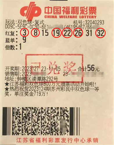 11月5日,雙色球第2023127期開出紅球3、8、19、22、26、32,藍球14。其中,二等獎中出253注,單注獎金12.1萬余元。當期一位購彩者在鐘樓區(qū)清潭路32040293福彩投注站,機選投注了一組復式號碼,幸運中得1注二等獎、12注四等獎、15注五等獎,共計中得獎金12.4萬余元。