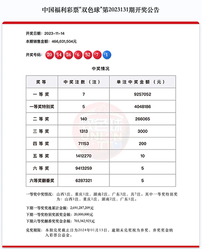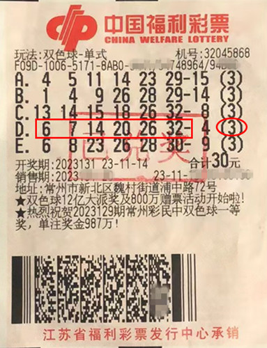 11月14日,雙色球第2023131期開出紅球6、7、14、20、26、32,藍球1。其中,二等獎中出140注,單注獎金26.6萬余元。當期一位購彩者在新北區(qū)魏村32045868福彩投注站,手選五組單式號碼并分別進行了3倍投注,沒想到其中一組紅球全中,擊中3注二等獎,共計攬獲獎金79.8萬余元。