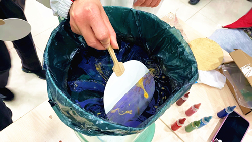 隨后,社工現(xiàn)場(chǎng)演示漆扇制作流程??祻?fù)員們踴躍上前體驗(yàn),以垂直入水、旋轉(zhuǎn)入水、Z型入水、斜入水等手法,形成妙趣橫生、自然天成的紋路圖案,做出一把把獨(dú)具特色的漆扇。大家還充分發(fā)揮想象力,為自己的漆扇取名。“層林盡染”“小橋流水人家”“落日煙霞”“紫云飄渺”……種種美好的意象都是康復(fù)員內(nèi)心世界的流露。